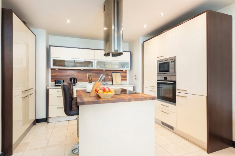 Kitchen: 3.50 m x 2.9m, with an extensive range of built-in units and storage presses, Neff oven, Neff hob, Elica stainless steel extractor fan, integrated Neff dishwasher, Indesit washing machine, stainless steel sink unit, porcelain tiled floors