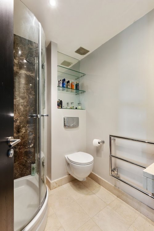 En- Suite Shower Room: with marble tiled step-in shower, wc with concealed cistern, wash hand basin, recessed lighting, heated towel rail