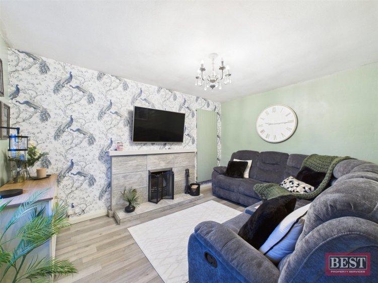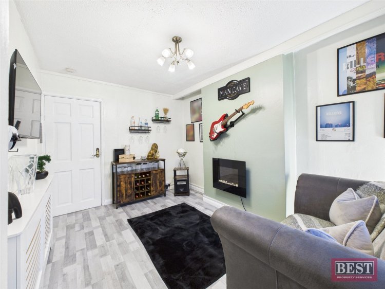 The property is entered via a welcoming entrance hallway featuring laminate flooring, with carpeted stairs leading to the first floor. To the front of the home are two bright reception rooms, both enjoying front-facing aspects and laminate flooring. The lounge provides a comfortable living space, while the living room is enhanced by a decorative fireplace with open fire, creating a warm and inviting focal point.