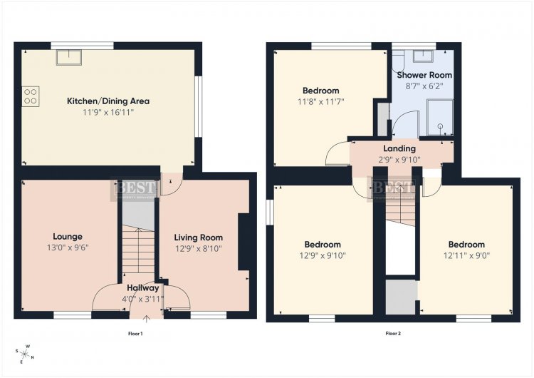 On the first floor, the landing features laminate flooring and provides access to the roof space. There are three well-proportioned bedrooms, all bright and airy: two front-facing bedrooms with vinyl and laminate flooring respectively, and a rear-facing bedroom finished with vinyl flooring. The accommodation is completed by a rear-facing shower room, fitted with a white suite including a separate shower cubicle with PVC panelling, vinyl flooring, and a heated towel rail.