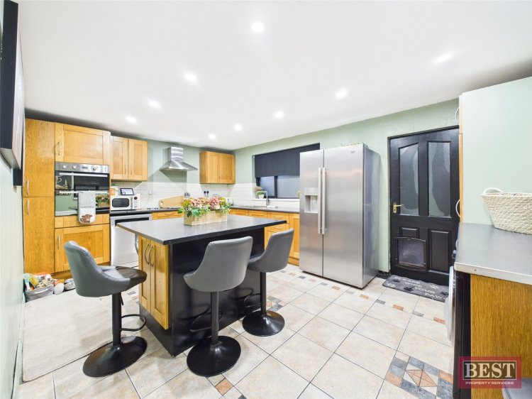 To the rear is a generous kitchen/dining area, fitted with a range of upper and lower level units and a central island. The room is finished with tiled flooring and is plumbed for both a washing machine and tumble dryer, with space for a cooker and fridge freezer — ideal for modern family living.