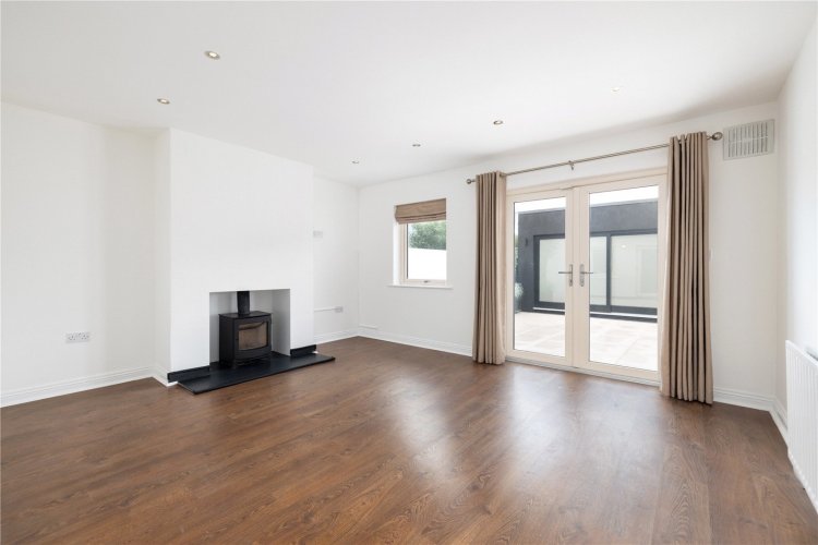 To the rear, the living room provides a warm and inviting setting, complete with a wood-burning stove and double French doors opening directly onto the patio and garden. This creates an excellent connection between the indoor and outdoor space and enhances the overall sense of openness and light.
