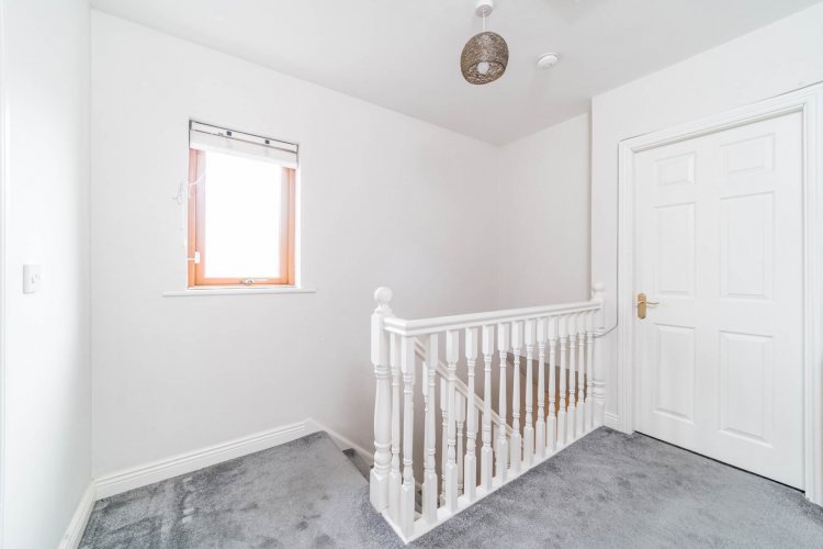 Landing (Including Hot Press) 3.5m x 3.1m Carpet flooring from stairway to landing, hanging pendant light with shade, venetian blinds and hotpress.