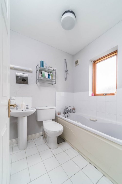 Family Bathroom 1.8m x 1.9m Tiled flooring and around bathub area, w.c., w.h.b. with tiled splash back, fitted mirror with shaving light, window and fitted shelf unit.