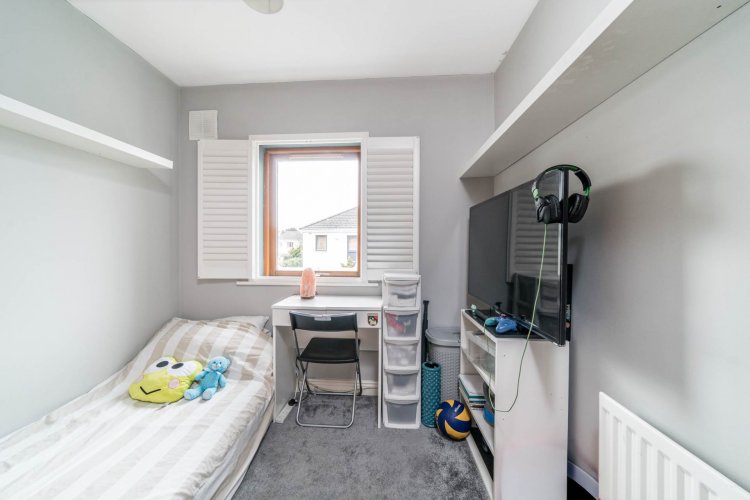 Bedroom 3 (Front) 4.3m x 2.9m Carpet flooring, hanging pendant light with shade, fitted wardrobes, plantation shutter blinds and access to attic via fitted folding ladder.