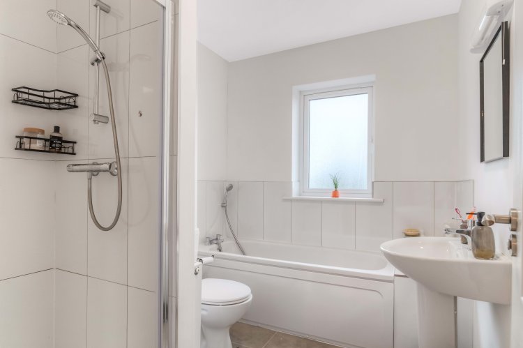 family bathroom with tiled flooring,,having bath, wc, whb & walk in shower |