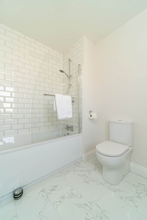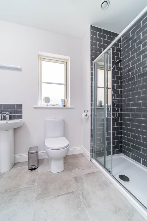 Ensuite 1.63m x 2.3m Tiled flooring, shower cubicle, w.c., w.h.b., fitted mirror with shaving light, light fitting, extractor fan and vertical heated towel rail.