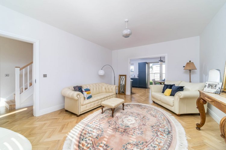Living Room 4.02m x 5.32m Herringbone oak flooring, light shade, blinds, tv point, double doors leading into dining area.