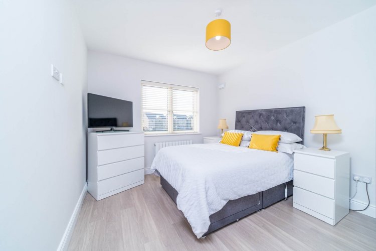 Bedroom 3 4.05m x 3.17m Facing front Laminate wood flooring, fitted wardrobes, light fitting and blinds.