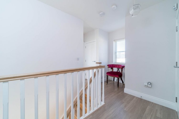 Landing Laminate flooring, hot-press, light fitting, attic access via folding ladder and storage closet.