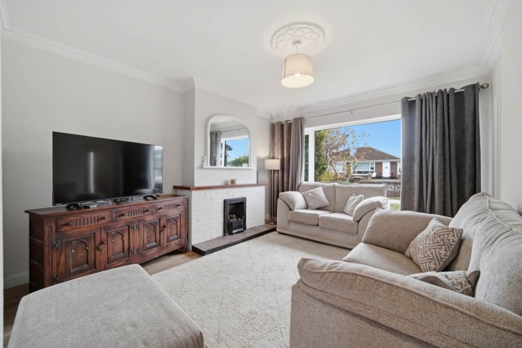 Living Room 4.53m x 3.61m Laminate flooring, hanging pendant light, coving, fireplace with brick surround and gas fire insert.