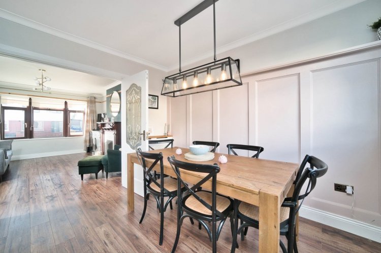 Kitchen/ Dining Area 3.3m x 5.7m Laminate floors, dimmable recessed lights, coving, wood panelled walls, door leading to the rear garden, kitchen sink, bespoke radiator covers, solid wood kitchen cabinets with oak counter top and brass handles, tiled splash back, integrated dishwasher, fridge/freezer, hob, extractor fan, microwave and oven.