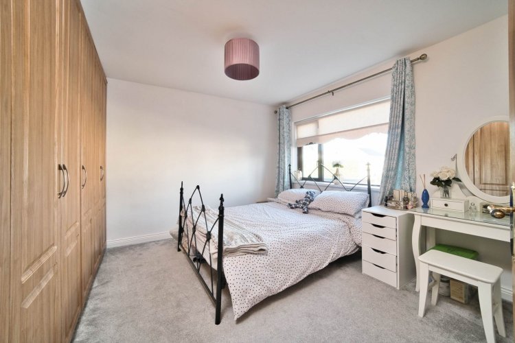 Bedroom 3 (Front) 2.4m x 2.7m Carpet floors, hanging pendant light, fitted wardrobes and roller blinds.