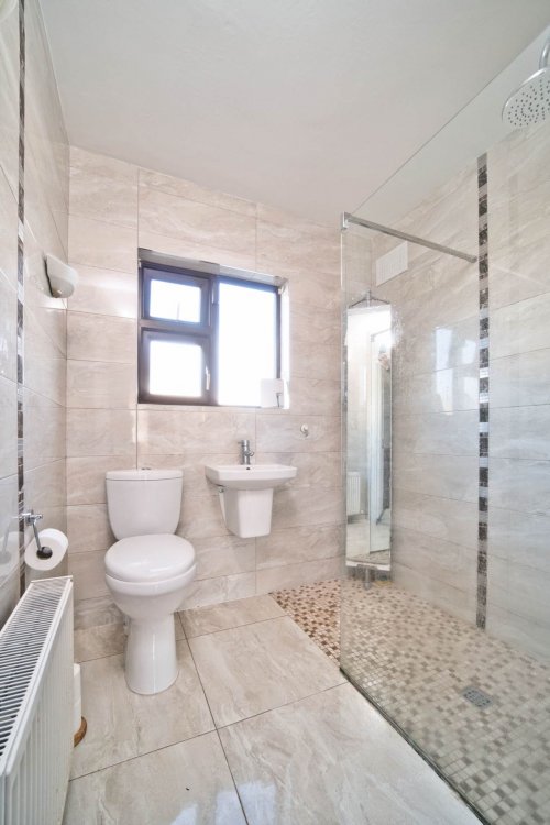 Family Bathroom 1.8m x 1.9m Fully tiled, w.c., w.h.b., fitted lights, fitted mirror, walk in wet room shower area with electric shower, monsoon shower head and fitted shower screen.