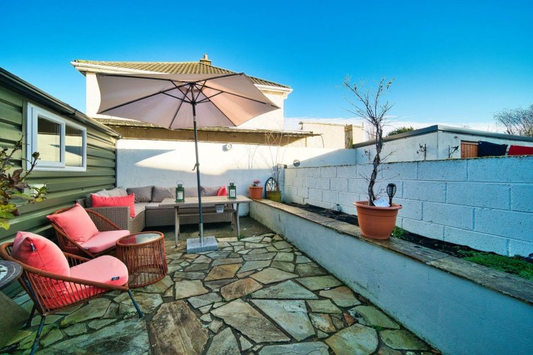Garden 10.6m x 7.2m Flagstone paving with raised flowerbeds, outdoor tap, side entrance with 6ft cavity block boundary wall and a fully plumbed steel shed with fitted lights.