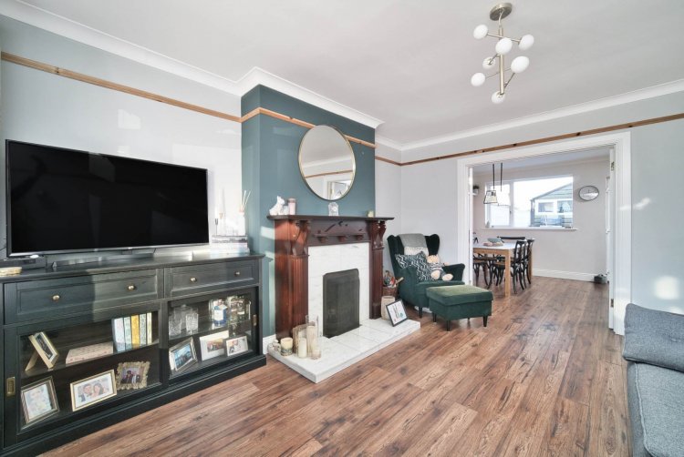 Living Room 3.8m x 4.6m Laminate floors, fitted wall lights, roller blinds, open fireplace with marble hearth and oak mantel piece, double French doors that lead into the kitchen and TV point.