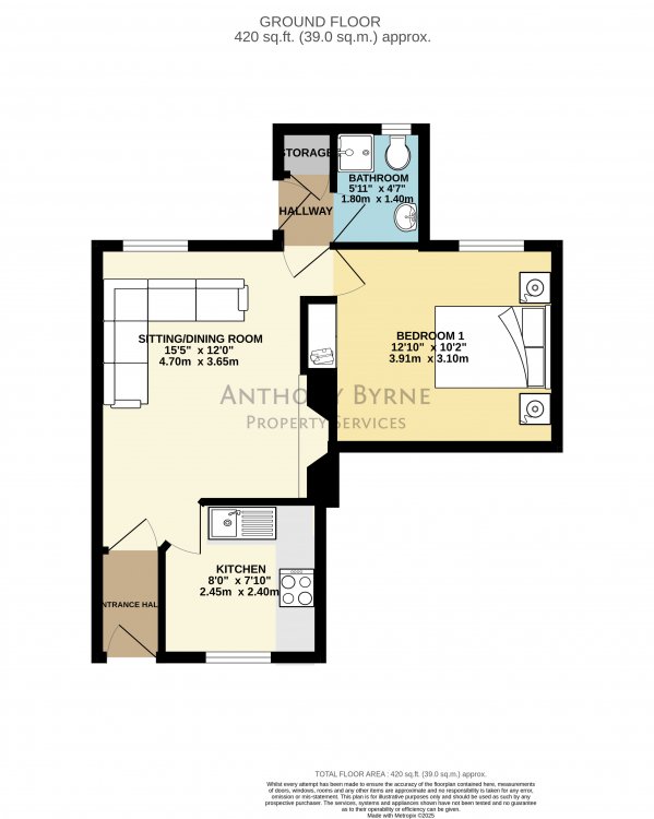 An approximate internal floor area of c.39m2. Consisting of an Entrance hall, Living room, Kitchen, Bathroom and Bedroom.