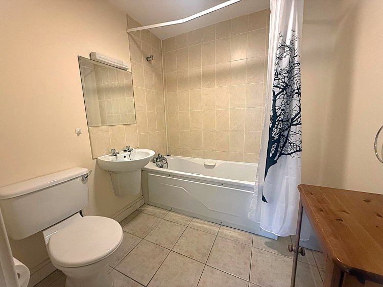 Finished with tiled flooring, toilet, wash hand basin and bath and has a fully tiled flooring and fully tiled around the bath area.