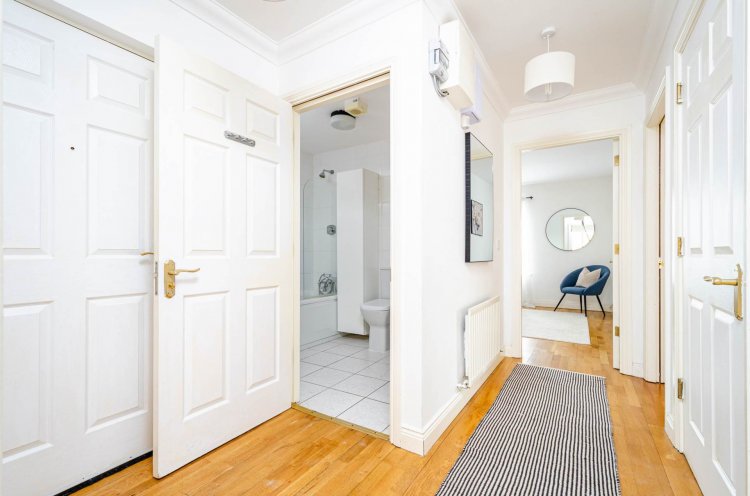 Bedroom 1 4.1m x 3m Wooden flooring, fitted wardrobe, second separate wardrobe with drawers and vanity unit, light fitting, curtains, blinds and door leading onto rear balcony.
