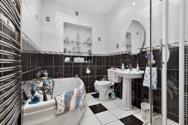 1.50m x 3.60m 4.92ft x 11.81ft | Finished with fully tiled floors, fully tiled walls, includes toilet, wash hand basin, bath and a separate shower. Very high standard of finish. Complete with vanity unit under sink and integrated mirror over. |