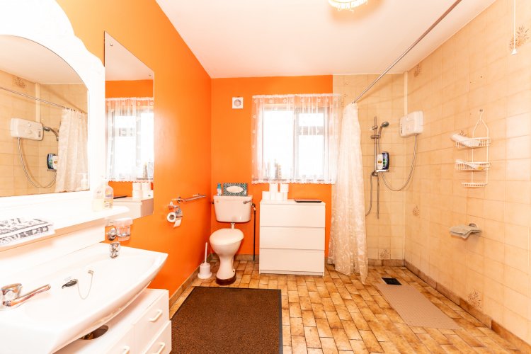 Main bathroom Tiled flooring and shower enclosure, electric shower, WHB, toilet, wheelchair accessible